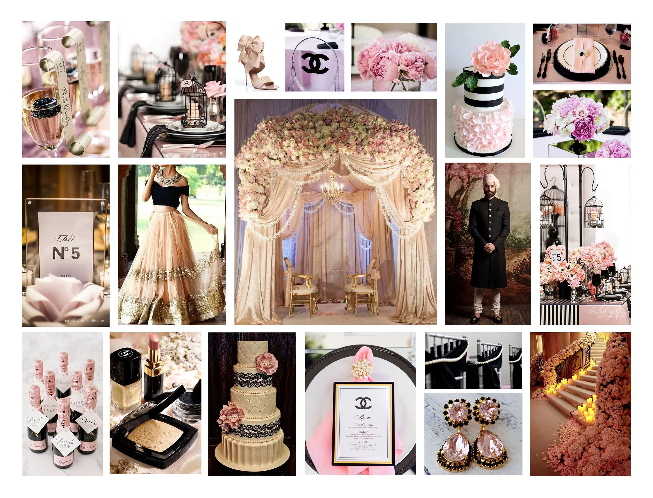 JANUARY 10, 2017 - Chanel: A brand rooted in timeless fashion with weaves of soft elegance. The blend of pale pinks and black tones resonate with the complex nature of mixing modern with traditional. In recent times, we have seen a growing trend of Indian weddings want to explore various themes and thought a Chanel inspired Indian wedding was a unique blend! The soft pinks, golds, ivories, and statement blacks piece together to create a classic look. The combination of textures and patterns such as lace and stripes are a staple for the signature Chanel look. The mixture of girlish charm with a dark statement color helps create a versatile twist that this themed wedding is craving. A variety of details could accompany such an event; servers in classic long tail tuxedos passing bubbly champagne with Chanel inspired logos on the glassware; luscious floral centerpieces accompanied by printed pink and black infused stationery; beautiful wall coverings of black and pink stripes accompanying textured pillows and lounge seating. Ideally, the options are endless! Explore the inspiration we’ve pieced together entitled, "The Chanel Indian Wedding".